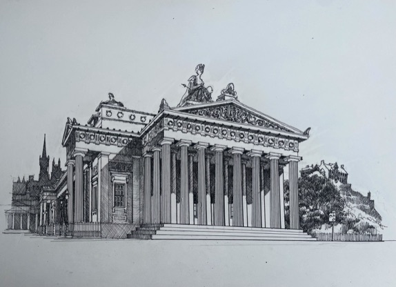 This format for these studies was devised in 2010 by Sharon McCord, then Editor of the newly launched Quarterly Journal of the Royal Incorporation of Architects in Scotland. At Sharon’s invitation Stuart’s sketches and impressions were published as a regular feature in the magazine, before subsequently being published as books by RIAS Publishing,